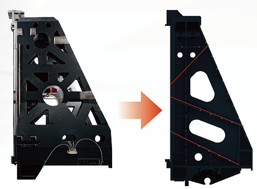 1. 一體式立柱加大跨距設(shè)計,寬度提升25%,剛性提升達15%;高剛性T型底座確保底座不變形及吸震能力強,線軌跨距高達 580mm。